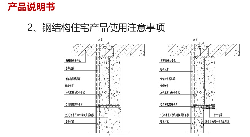 1、鋼結構住宅產品構造與材料說明。鋼結構住宅應用較多新材料、新部品、新技術,盡量向用戶開誠布公的講清楚,免得用戶不了解產生誤會。比如輕質隔墻、各類保溫做法、防火做法、裝配式裝修做法等,不一定講很深的技術細節,要講清楚這些材料選用、構造做法的重要性、設計依據的國家規范圖集等。之前國內發生過用戶認為輕質保溫材料是建設方偷工減料的案例。