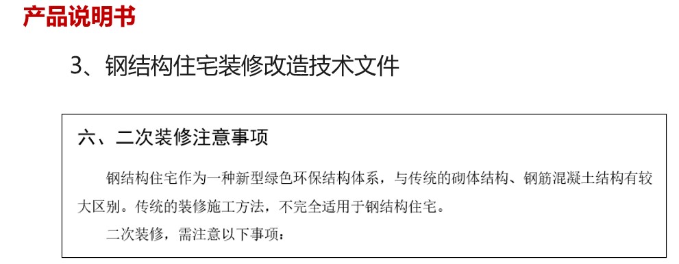 3、鋼結構住宅裝修改造技術文件。住宅的二次甚至多次裝修改造,是住宅產品應用中一個常見的場景,不可避免,即使是精裝交付的產品。因為裝修的壽命低于住宅產品的壽命,現實中也存在住宅多次入市交易的情況。產品說明中應有裝修改造的這一塊內容,下一小結重點講述。