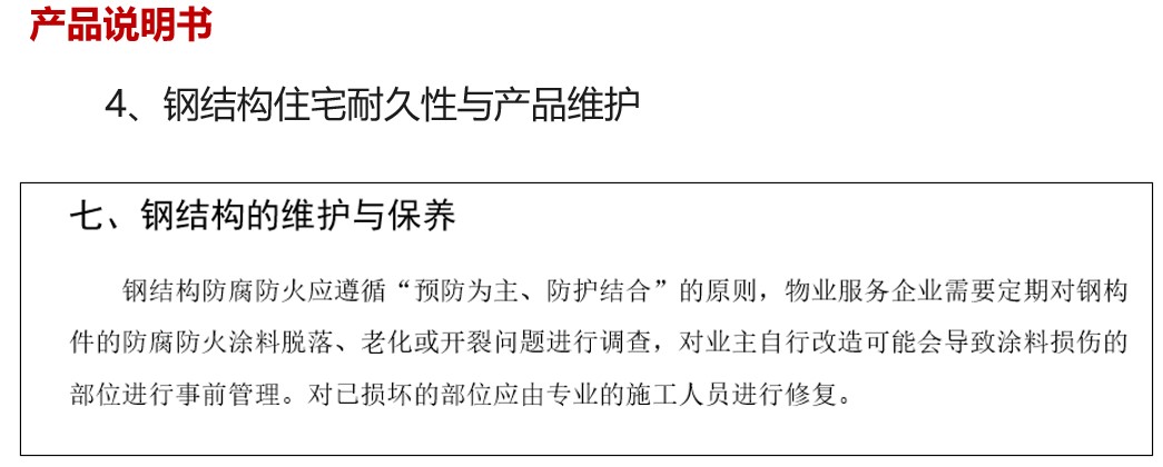 4、鋼結構住宅耐久性與產品維護。任何產品都有耐久性與維護問題,鋼結構住宅也不例外。產品維護保養一般是物業的事情,有房屋維修基金,與用戶關系不大。但說明書中也應有這部分內容,下一小結也會講述。