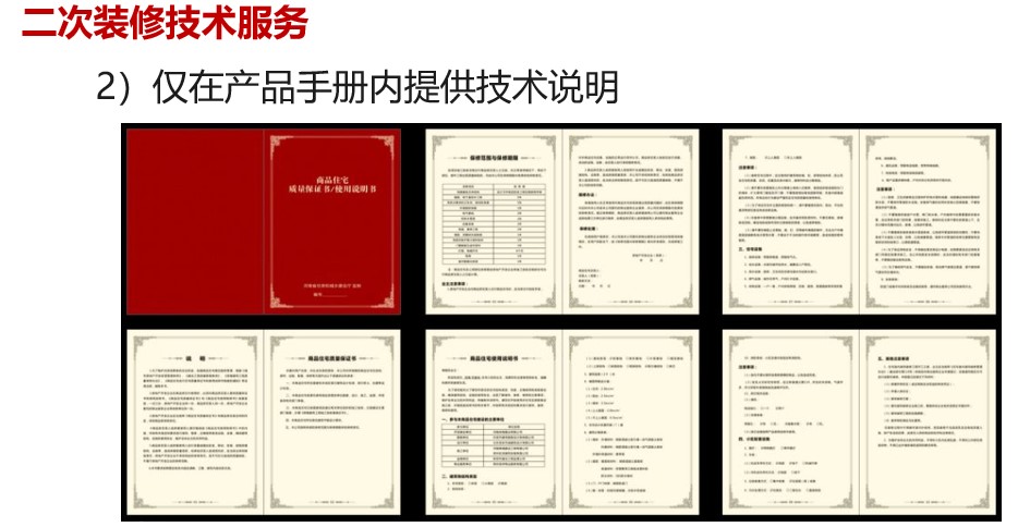 2、對于市場上面向中端以下大眾的普通住宅產品,至少應該在產品說明書中提供二次裝修的技術說明。用戶可以通過自己查看產品說明書,學習了解相應的技術指標,避免盲目裝修帶來不可控問題。