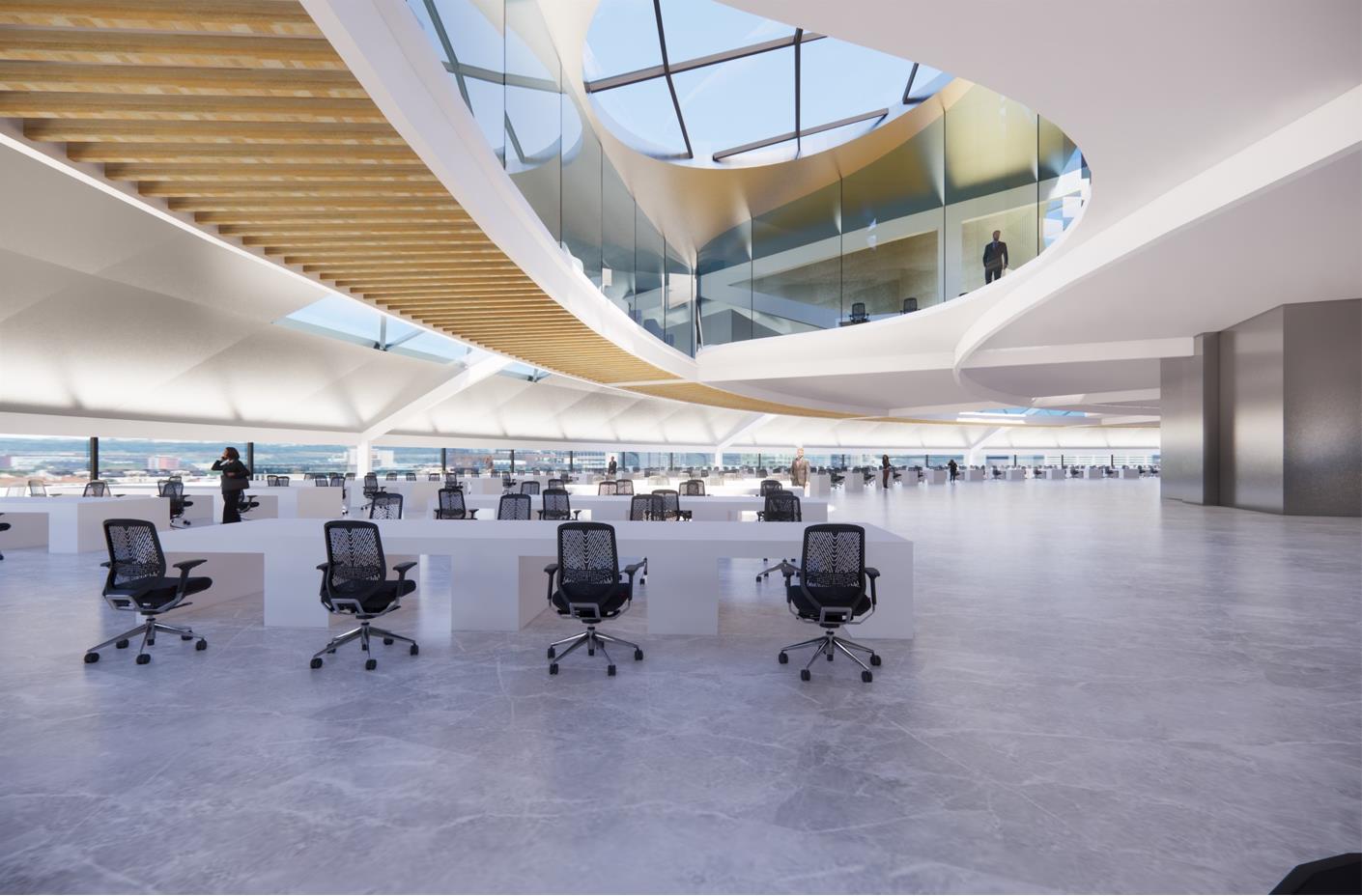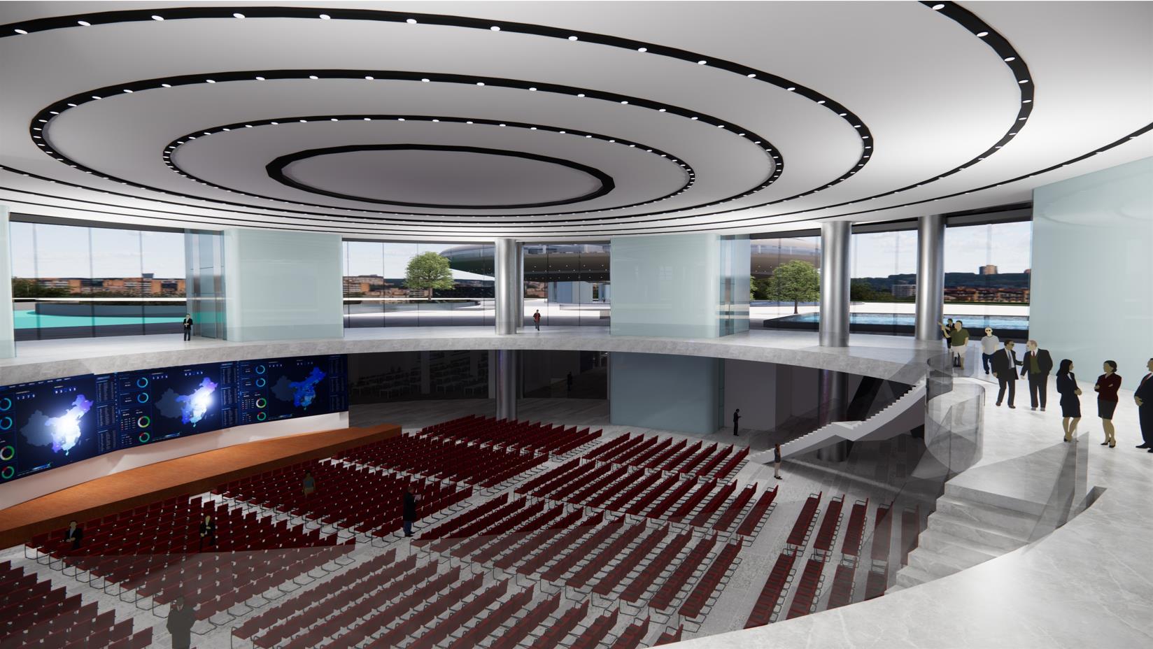 “飛碟”單體建筑高度為32米,地上建筑面積4.5萬平方米,地上4層,地下1層。獨(dú)特的飛碟造型既定了設(shè)計(jì)空間的形體策略,建筑的首層和穹頂為縮小的圓形平面,2-4層以舒展的形態(tài)向外延伸。從頂部看,飛碟的投影最大總直徑138米,其中懸挑部分達(dá)37米。建筑內(nèi)部的中心區(qū)域形成“雙中庭”的概念,以中庭為媒介,實(shí)現(xiàn)首層與地下1層連通,2-4層各空間連通,促進(jìn)各功能區(qū)域之間的交流,營造辦公文化的場所精神。建筑功能的置入井然有序,相互獨(dú)立又緊密聯(lián)系,其中地上功能包括牧原榮譽(yù)殿堂(會議典禮性質(zhì))、科技眾創(chuàng)空間、檢驗(yàn)認(rèn)證中心、科研研究中心、產(chǎn)學(xué)研合作基地、大數(shù)據(jù)采集中心、牧原工業(yè)4.0全球養(yǎng)豬智能控制,養(yǎng)豬生產(chǎn)總控,參觀展示等,地下功能為食堂及車庫等配套服務(wù)。